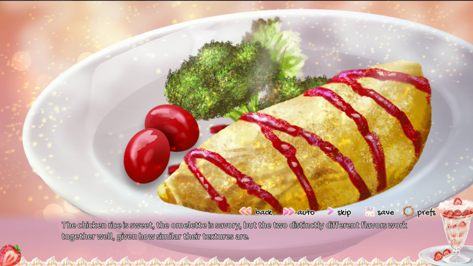 The writing is quite good. Perhaps sometimes a bit too wordy for a nine-year-old, but then again, it is repeatedly established that Rie is smarter than the average nine-year-old, so it's not completely out of place. The artwork really shines here, particularly in the CGs. SillySelly has done work on a few of ebi-hime's visual novels now, but I feel her best work is here. There are lots of CGs of food and few CGs of people, and more food porn abounds here than in the Game of Thrones books. And it's pretty sweet.